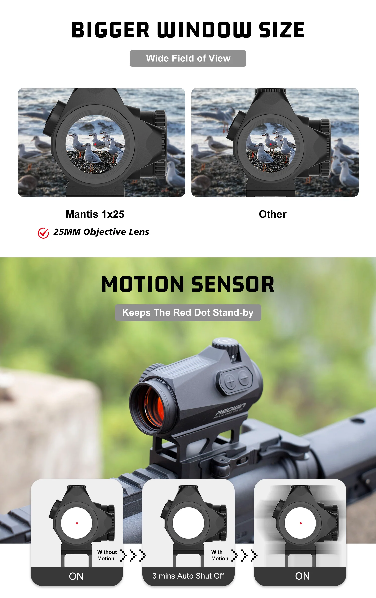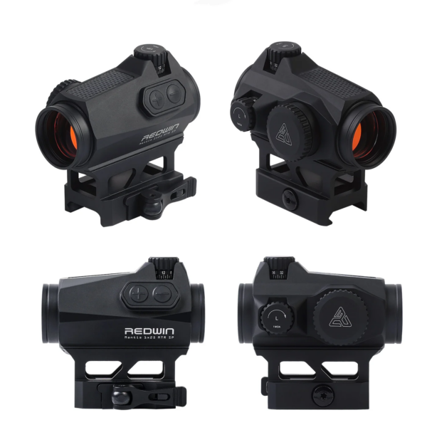 Redwin Mantis jest również przygotowany do codziennego użytkowania, ponieważ posiada odporność na wstrząsy i zaparowanie, a test odrzutu wynosi 800 g. Co więcej, bateria CR2032 może pracować nawet do 30 000 godzin (na poziomie jasności 4), więc nie musisz często jej wymieniać. Montaż Weaver/Picatinny ułatwia instalację, a w zestawie dostajesz zarówno mocowanie Low, jak i Riser, dlatego dopasujesz wysokość do swojej konfiguracji.