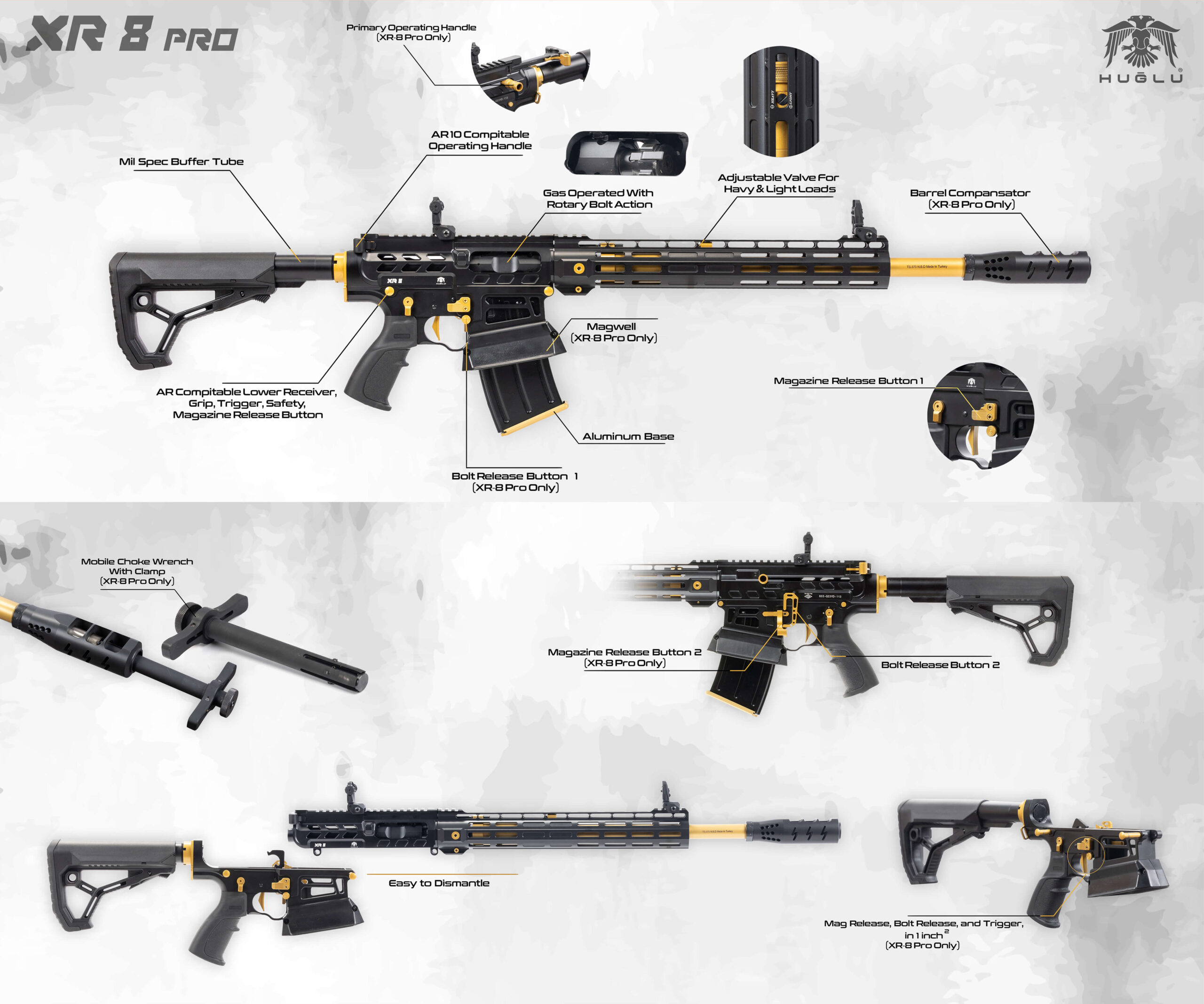Huglu XR8 to wysoce zaawansowana strzelba powtarzalna klasy premium, dedykowana do wymagających zastosowań, takich jak dynamiczne strzelectwo sportowe. Model ten wyróżnia się zarówno eleganckim designem, jak i precyzją oraz niezawodnością. Dzięki złotym akcentom, strzelba zyskuje unikatowy wygląd, co sprawia, że jest równie efektowna co funkcjonalna.